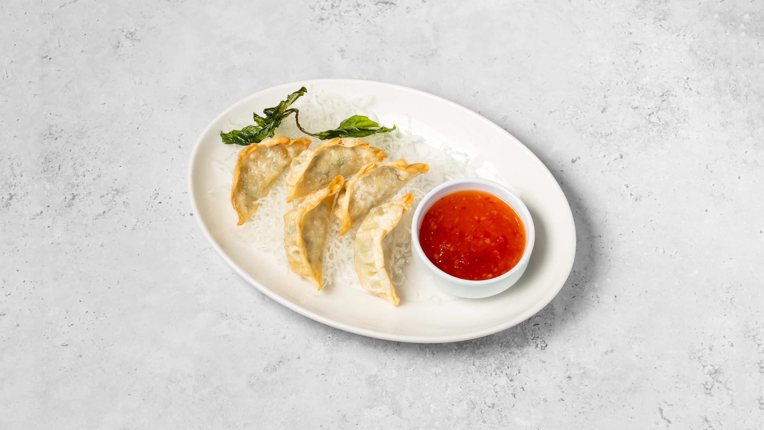 Fritert scampi, agurk toppet med flambert laks, teriyaki, chilimajones og sprøstekt løk