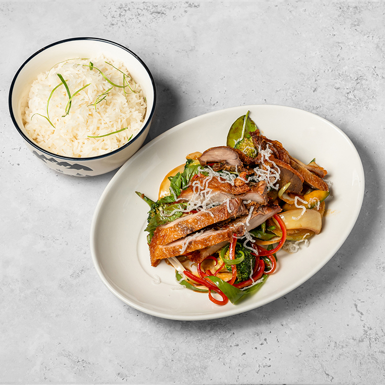 Saigon grillet and med grønnsaker i set mild hoisinsaus. Serveres med ris. Allergener - inneholder gluten
