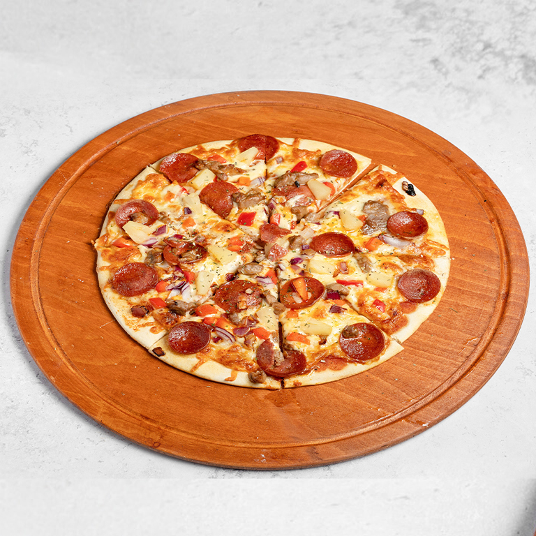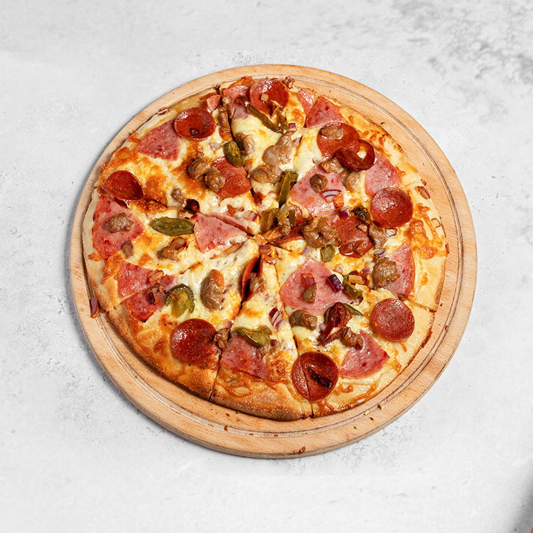 Skinke, Pepperoni, Biff, Kylling,Løk Paprika og Champignon