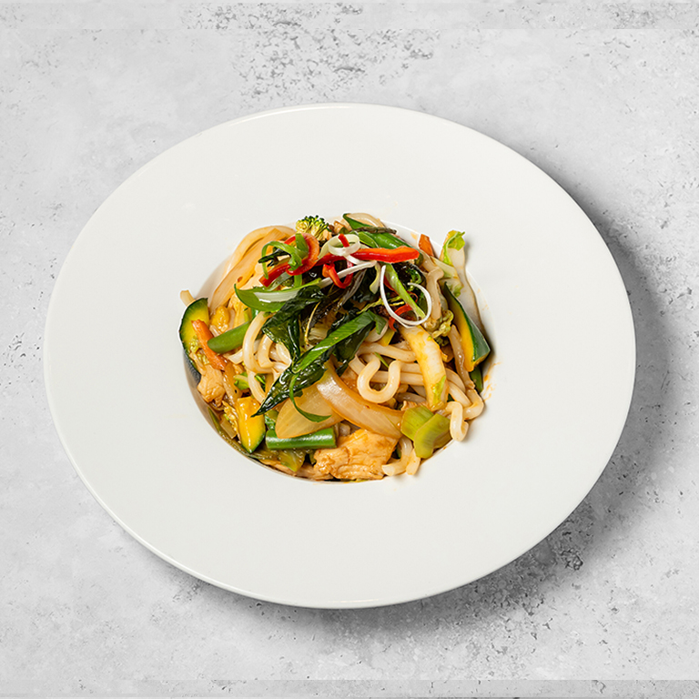Japansk udon risnudler med grønnsaker, østerssalis og soyasaus. Velg mellom biff, kylling eller sjømat Allergener - inneholder soyabønner eller produkter derav Velg mellom : Biff / Reker / Kylling