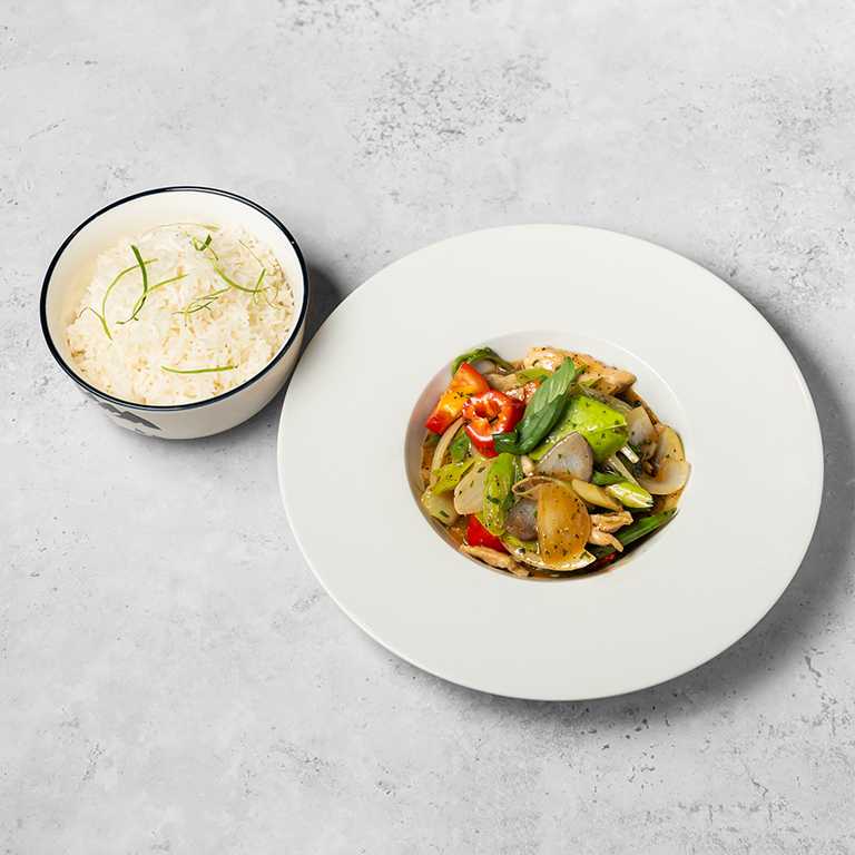 Kylling, grønnsaker, cashewnotter i en smaksfull kinesiska saus. Serveres med ris